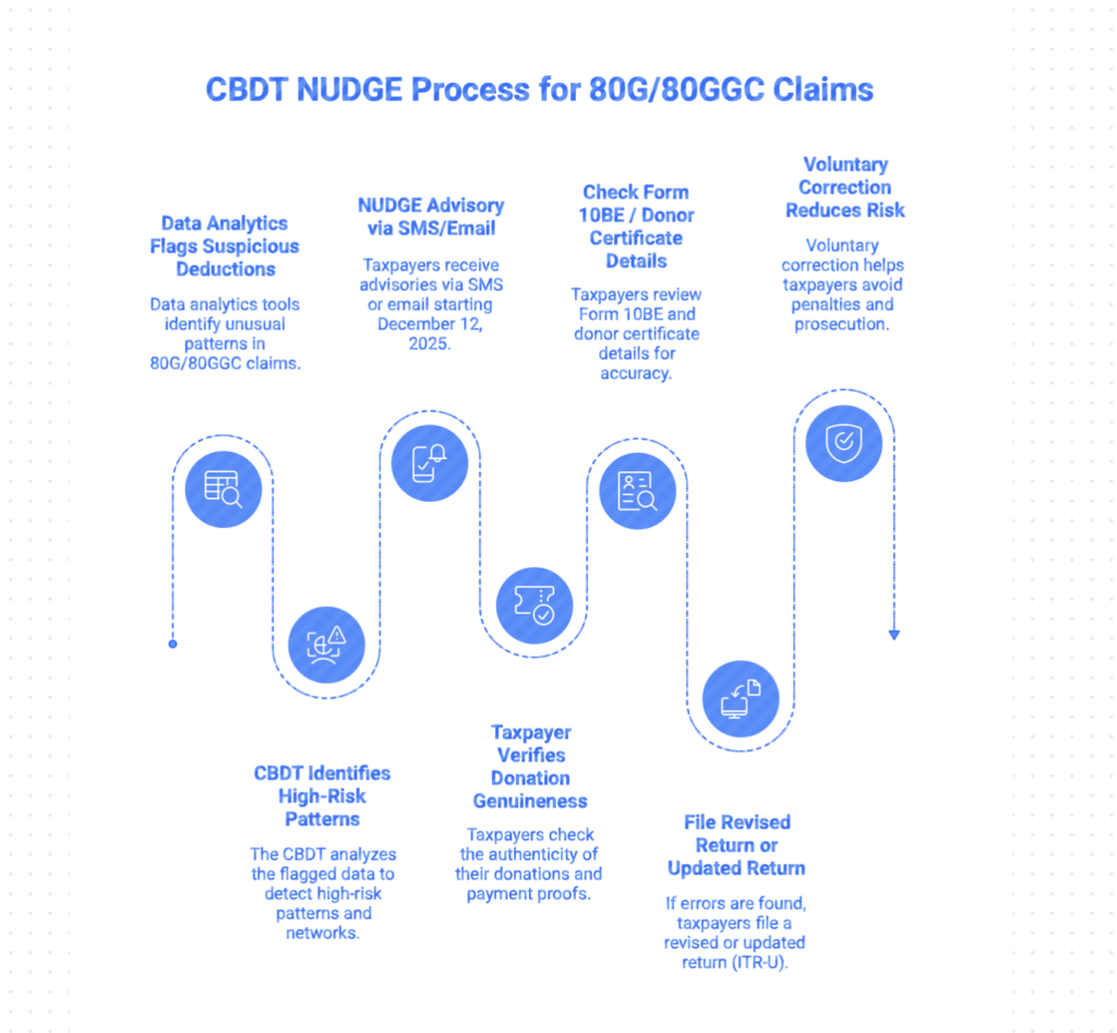 CBDT has strengthened a data-driven approach to detect suspicious claims early. Instead of starting action against everyone at once, CBDT has launched a taxpayer-friendly NUDGE campaign (a soft compliance push). Under this, the department is sending SMS and email advisories from 12 December 2025 to taxpayers whose donation claims show high-risk patterns.