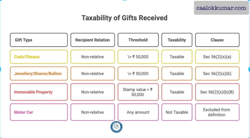 Section 56(2)(x) taxes the fair-market value (FMV) of any “prescribed movable property” received without consideration if its total value exceeds ₹ 50,000 in a financial year.